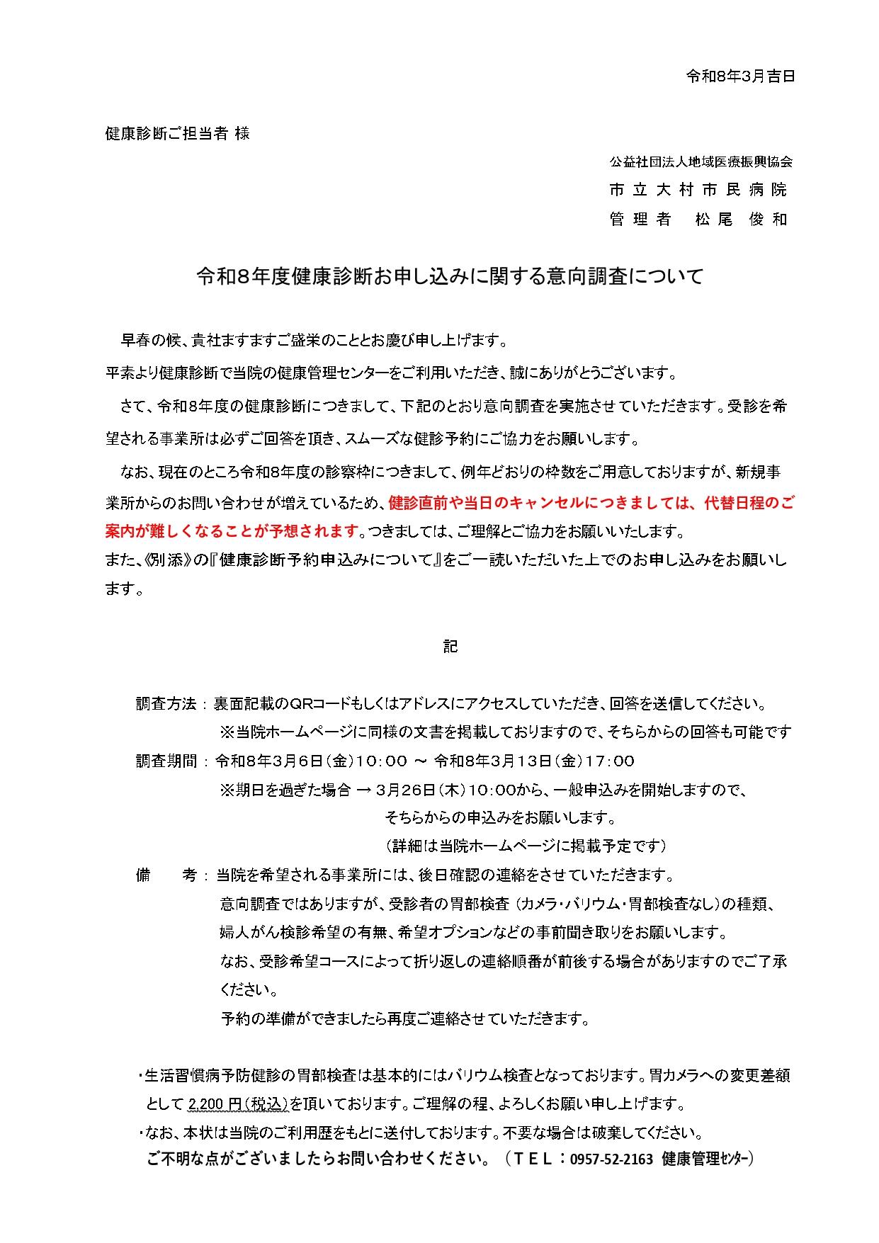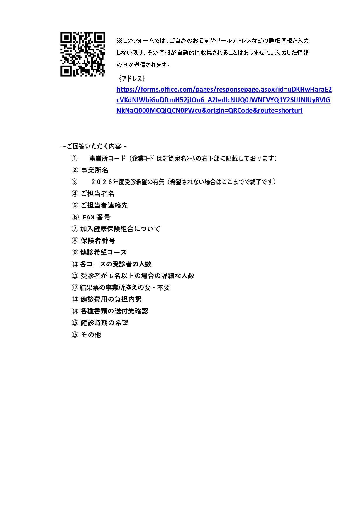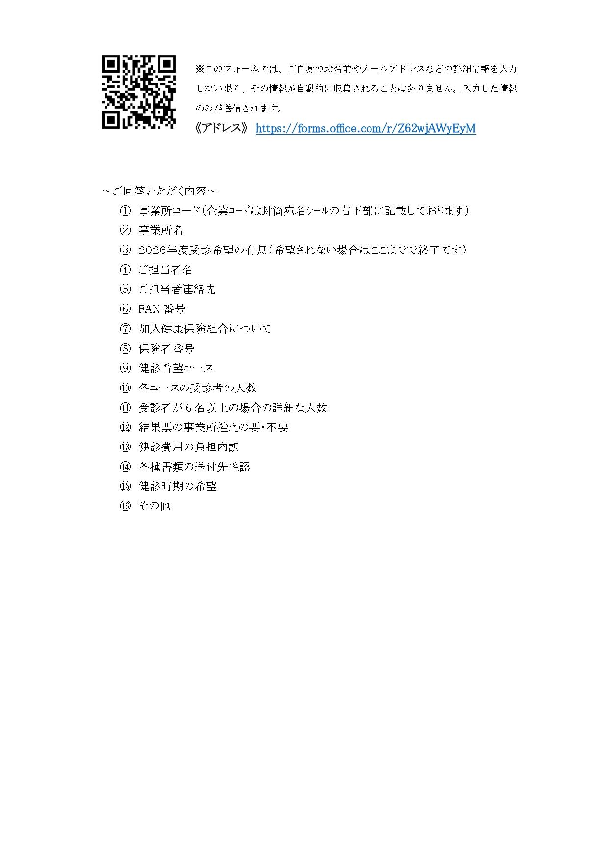 最新情報 2026.03.03 R8年度企業健診お申し込みに関する意向調査について 意向調査 ご案内文書 別添 健診予約申し込みについて コース一覧 検査内容一覧(コース別) 検査内容一覧(協会けんぽ) 検査内容一覧(特定健診等) オプション表 オプション表① オプション表②